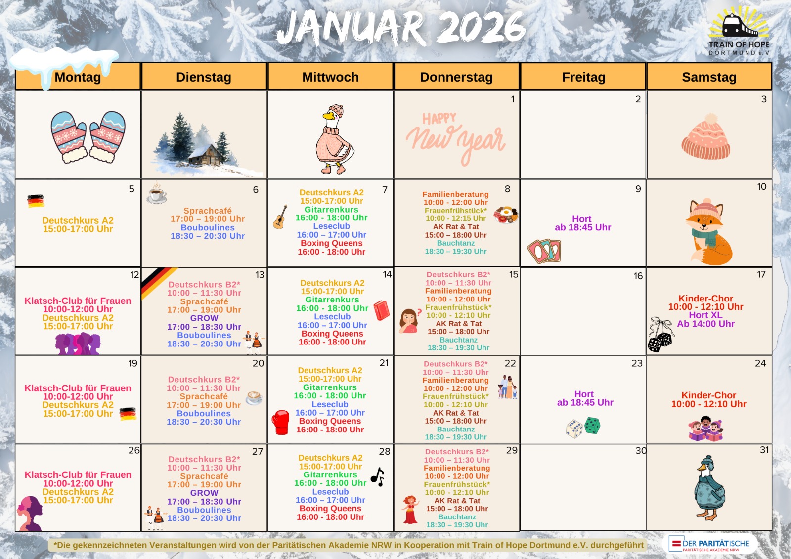 Train of Hope Dortmund e. V. fungiert als Migrantenselbstorganisation (MSO), anerkannter Jugendhilfeträger und Antidiskriminierungsservicestelle in der Flüchtlingshilfe. Leidenschaftlich setzen wir uns für die Themen Flucht & Migration, Kinder & Jugend, Gender & LGBTIQA* sowie Arbeit & (Weiter-)Bildung ein. Entdecke auf unserer Webseite mehr über unsere vielfältigen Projekte und wie Du Teil unserer unterstützenden Gemeinschaft werden kannst.