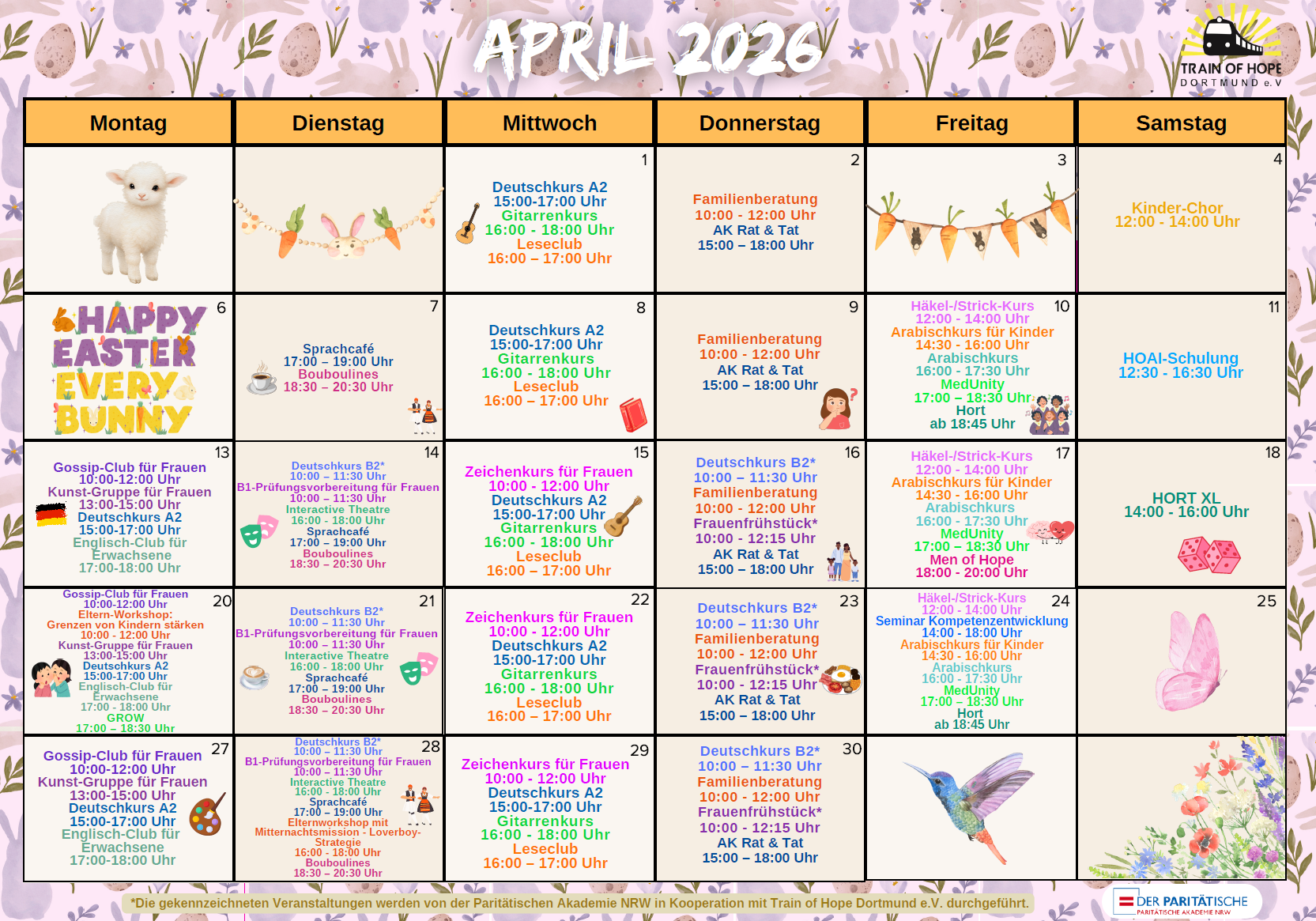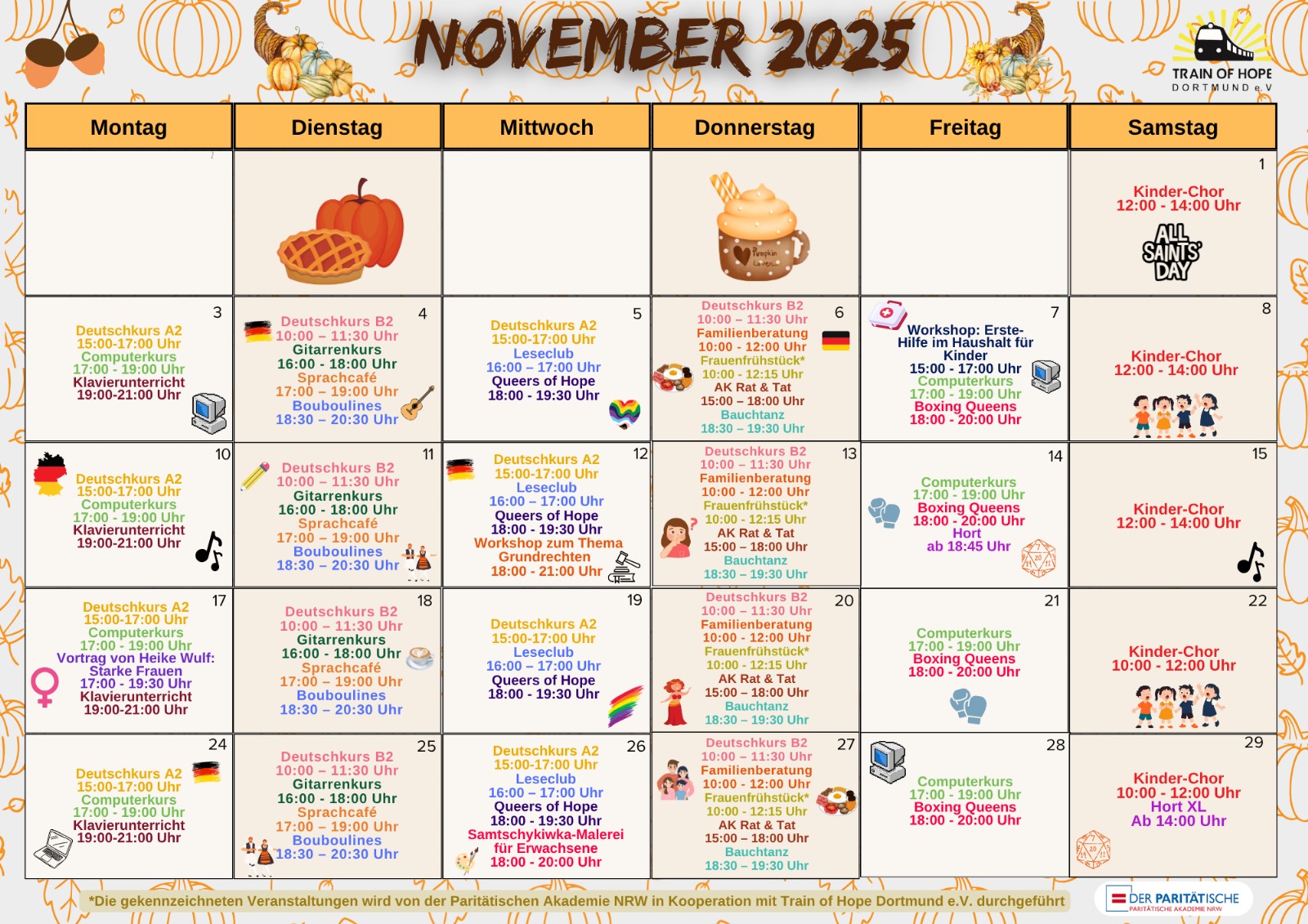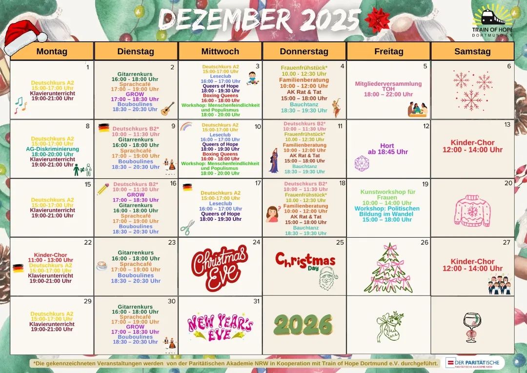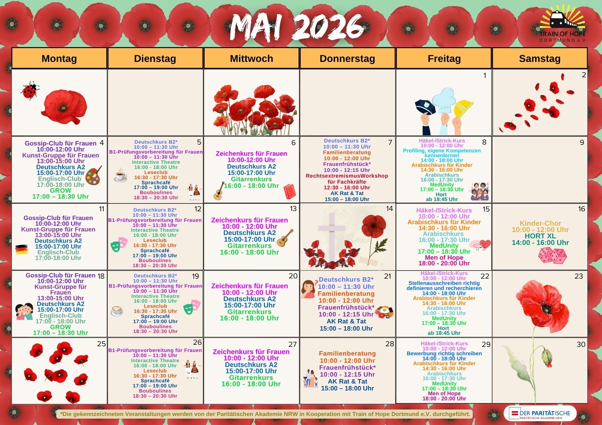 Train of Hope Dortmund e. V. fungiert als Migrantenselbstorganisation (MSO), anerkannter Jugendhilfeträger und Antidiskriminierungsservicestelle in der Flüchtlingshilfe. Leidenschaftlich setzen wir uns für die Themen Flucht & Migration, Kinder & Jugend, Gender & LGBTIQA* sowie Arbeit & (Weiter-)Bildung ein. Entdecke auf unserer Webseite mehr über unsere vielfältigen Projekte und wie Du Teil unserer unterstützenden Gemeinschaft werden kannst.